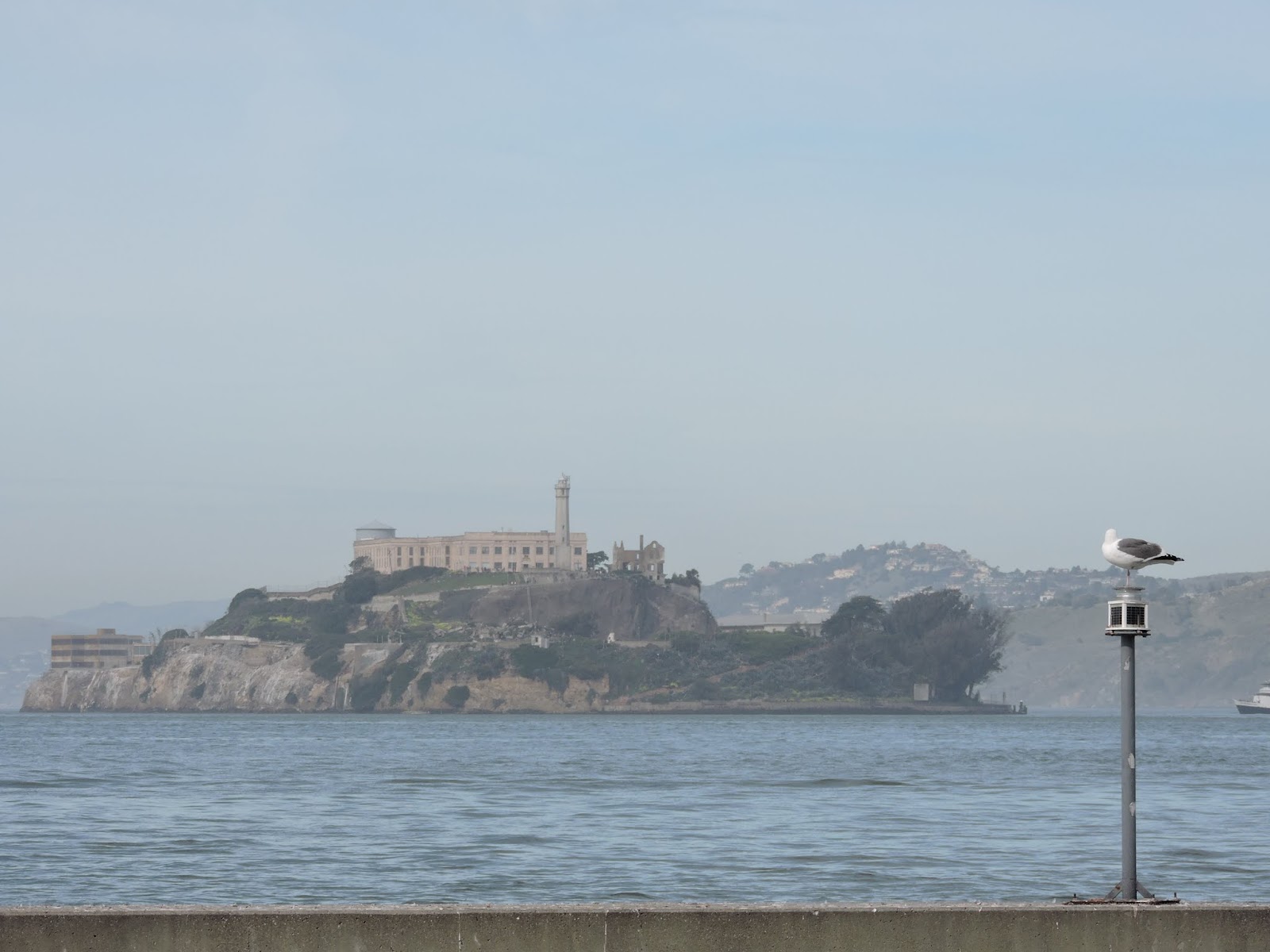 Nous avons très vite rencontré les morses. Qui sont arrivés là après le tremblement de terre de 1989. Au départ les gens du port étaient agacés, mais ils ont fini par voir d'un bon oeil cette nouvelle attraction locale (et gratuite!). Derrière eux se dresse la sinistre prison Alcatraz...